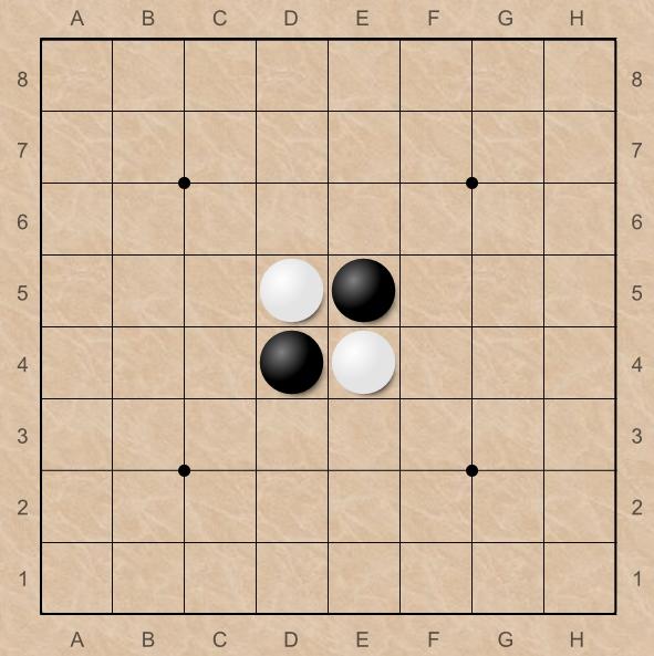 В начале игры в центр доски выставляются 4 фишки: чёрные на d4 и e5, белые на d5 и e4.