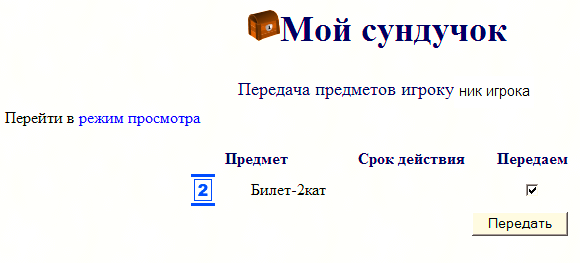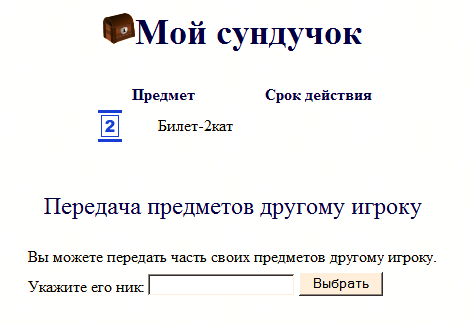 Наполнять сундучок можно участвуя в турнирах. После того как, Вы ввели ник игрока и нажали кнопку "Выбрать", на экране включается режим выбора предметов для передачи. (Рисунок2: передается один билет на турнир 2-й категории)