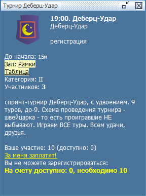 Игрок, за участие в турнире которого Вы хотите заплатить, должен мышкой кликнуть на тот турнир, в котором он хотел бы участвовать. При этом у него появится окно турнира: (рисунок 1)