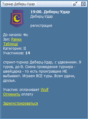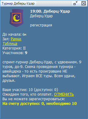 Выбрав эту ссылку, игрок, за которого Вы заплатили, получает возможность играть в турнире. Вы при этом получите в чате сообщение: "Игрок ХХХХХ зарегистрировался в турнире". А если он передумает, то сообщение в чате будет выглядеть вот так: "Игрок ХХХХХ отменил свой запрос на оплату турнира".